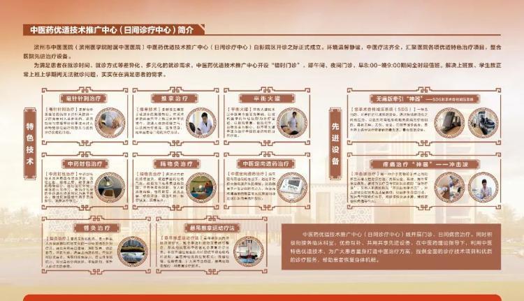 滨州市中医医院(滨州医学院附属中医医院)中医药优适技术推广中心(日间诊疗中心)正式成立于2022年新院区开诊之际,是传承、创新、推广、发扬中医药外治技术,并应用中医药外治技术服务于患者的新兴科室。科室始终秉承“精诚仁和 守正创新 中西贯通 济世为民”的医院宗旨,坚持打造“错时服务”科室特色亮点。全体医护人员将不断精进医疗水平、提升服务质量,利用中医特色优适技术,为每一位患者量身打造中医治疗方案,做广大人民群众的“健康守护者”。